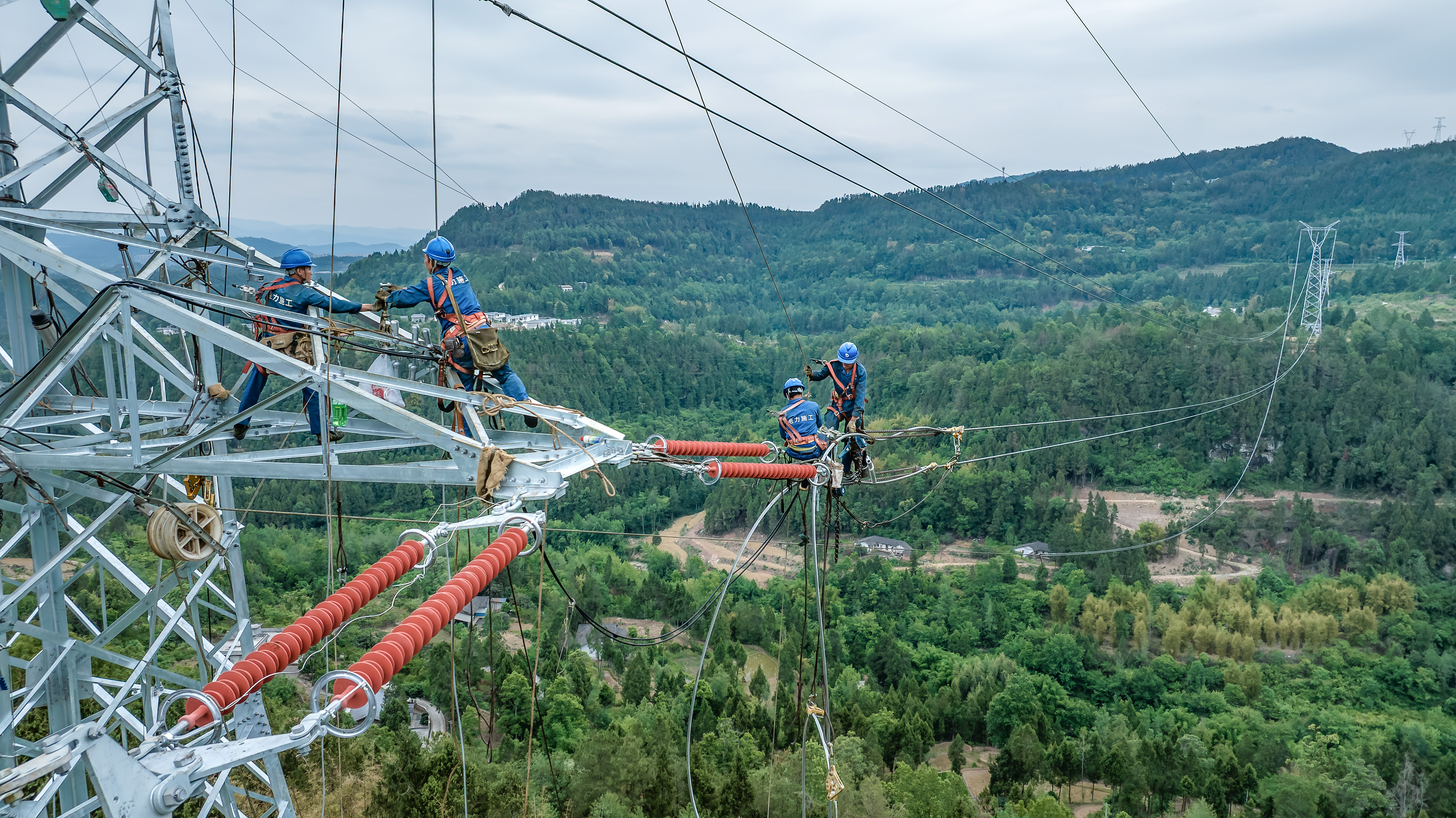 5月31日,国网巴中供电公司施工人员在巴中曾口220千伏线路工程开展断线及附件安装工作。(王志刚 摄)